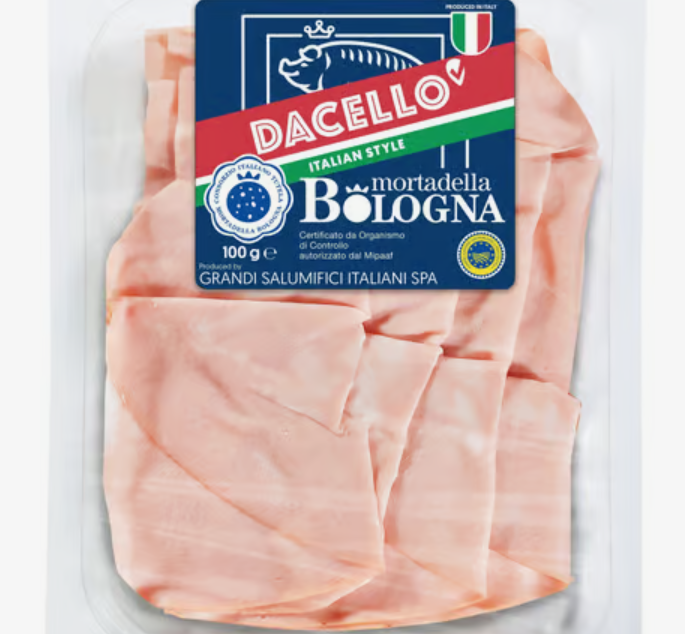 Este o mortadella italiana feliata, comercializata sub brandul Dacello, realizata conform specificatiilor Mortadella Bologna IGP.