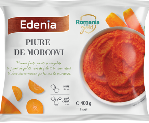 Morcovi fierti, pasati si congelati in forma de peleti, usor de folosit in orice reteta in doar cateva minute, pe foc sau la microunde.