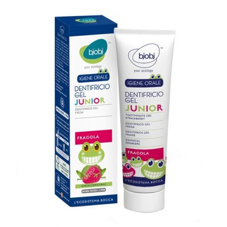 Pasta de dinti bio fara fluor pentru copii cu aroma naturala de capsuni. Pasta de dinti bio pentru copii Bjobj este o pasta de dinti homeopata care elimina placa dentara si protejeaza gingiile. Pasta de dinti pentru copii contine aloe vera, galbenele si are o aroma naturala de capsuni.